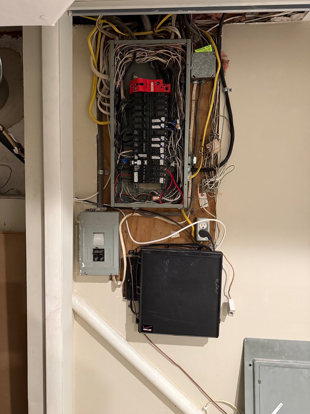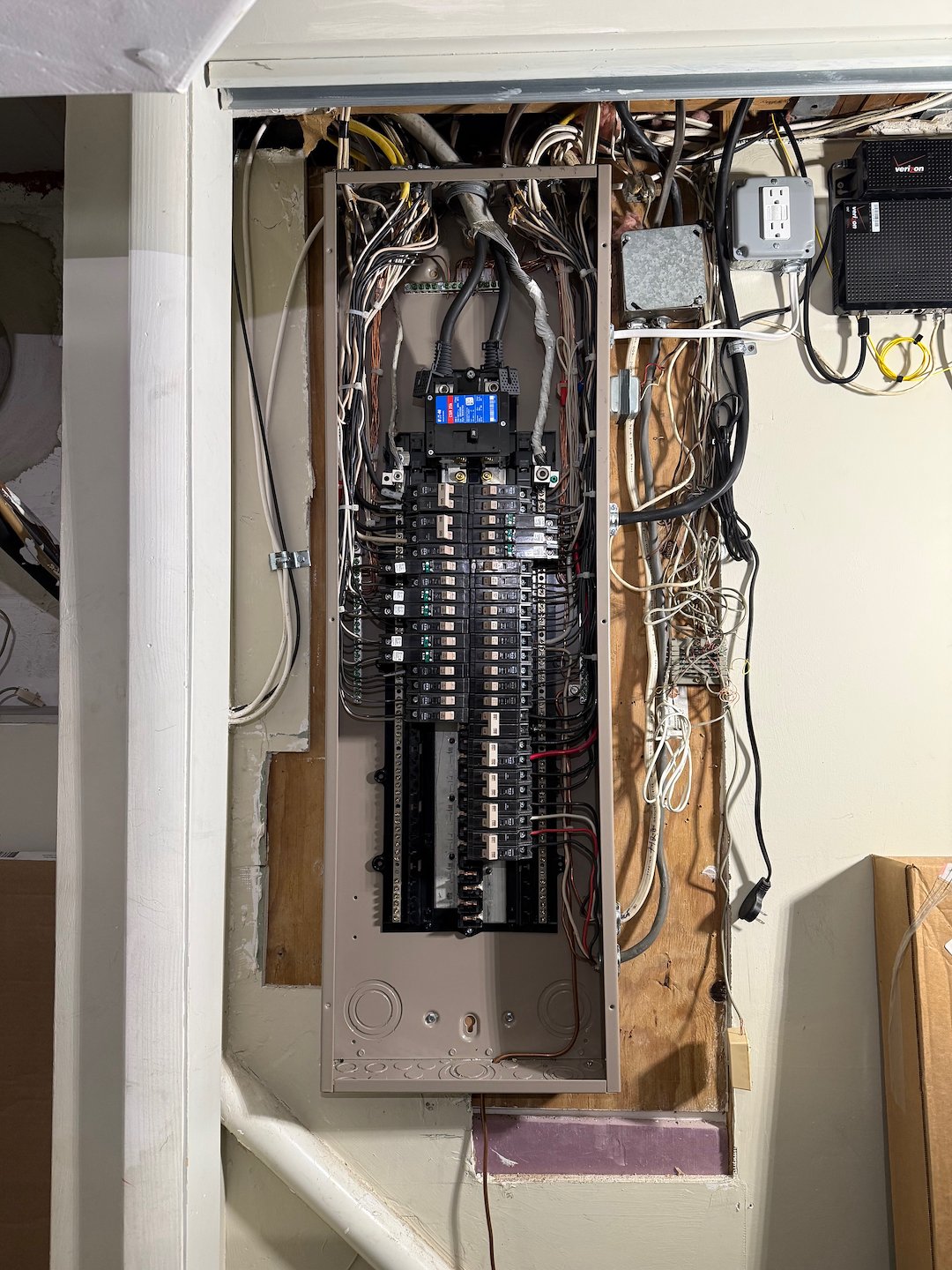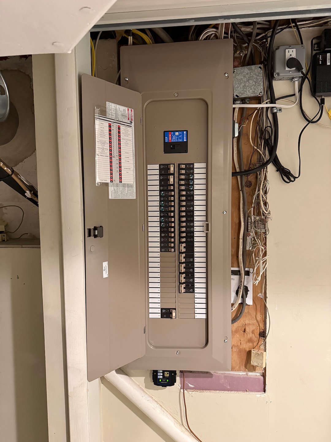 We were called out to our clients home in Willow Grove, PA., to talk about adding a new outlet on a dedicated circuit to the master bathroom. Upon investigating the circuit breaker panel we found that the panel was old, full and very poorly installed. We upgraded his old panel to a much larger 60 circuit panel for this electrical installation. We also removed the old off peak meter system which isn't used anymore and cleaned up the area around it. This electric installation also included in placing the wires back into the panel in a neat and orderly fashion as well. The client was thrilled with their new panel and the extra space that they now have to expand on their electrical system. We also added whole house surge protection for their added safety.